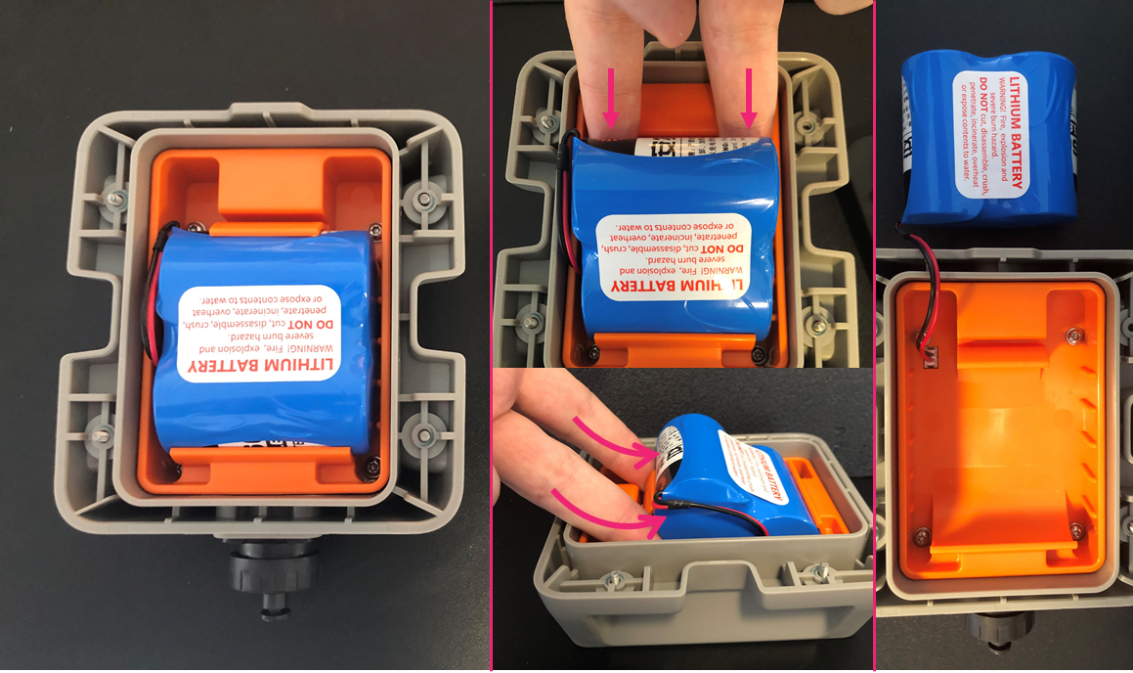 Flip over the top half of the enclosure making the battery pack is clearly visible. Position two fingers around the battery and firmly pull up; the battery should pop out of its holder. Ensure you do not pull or rip the red & black cables attaching the battery pack to the device.