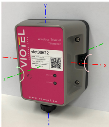 With the Viotel logo legible and node viewed from the left; a clockwise rotation around the horizontal axis (X Axis) will produce a positive angular change. Anticlockwise rotation around the horizontal axis (X Axis) will produce a negative angular change.